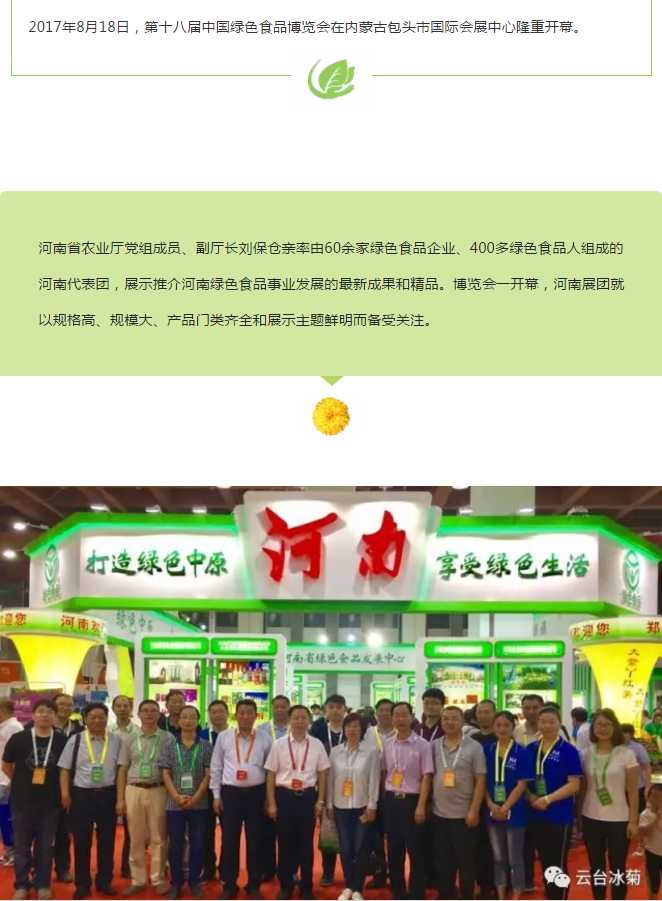 云臺(tái)冰菊不僅凸顯了河南綠色食品大家族、新發(fā)展和新形象,也為本屆博覽會(huì)“綠色理念、綠色生產(chǎn)、綠色消費(fèi)”主題貢獻(xiàn)了一己之力,受到蒞會(huì)領(lǐng)導(dǎo)、廣大市民、國(guó)內(nèi)外客商和各類(lèi)媒體的廣泛關(guān)注和高度稱(chēng)贊。